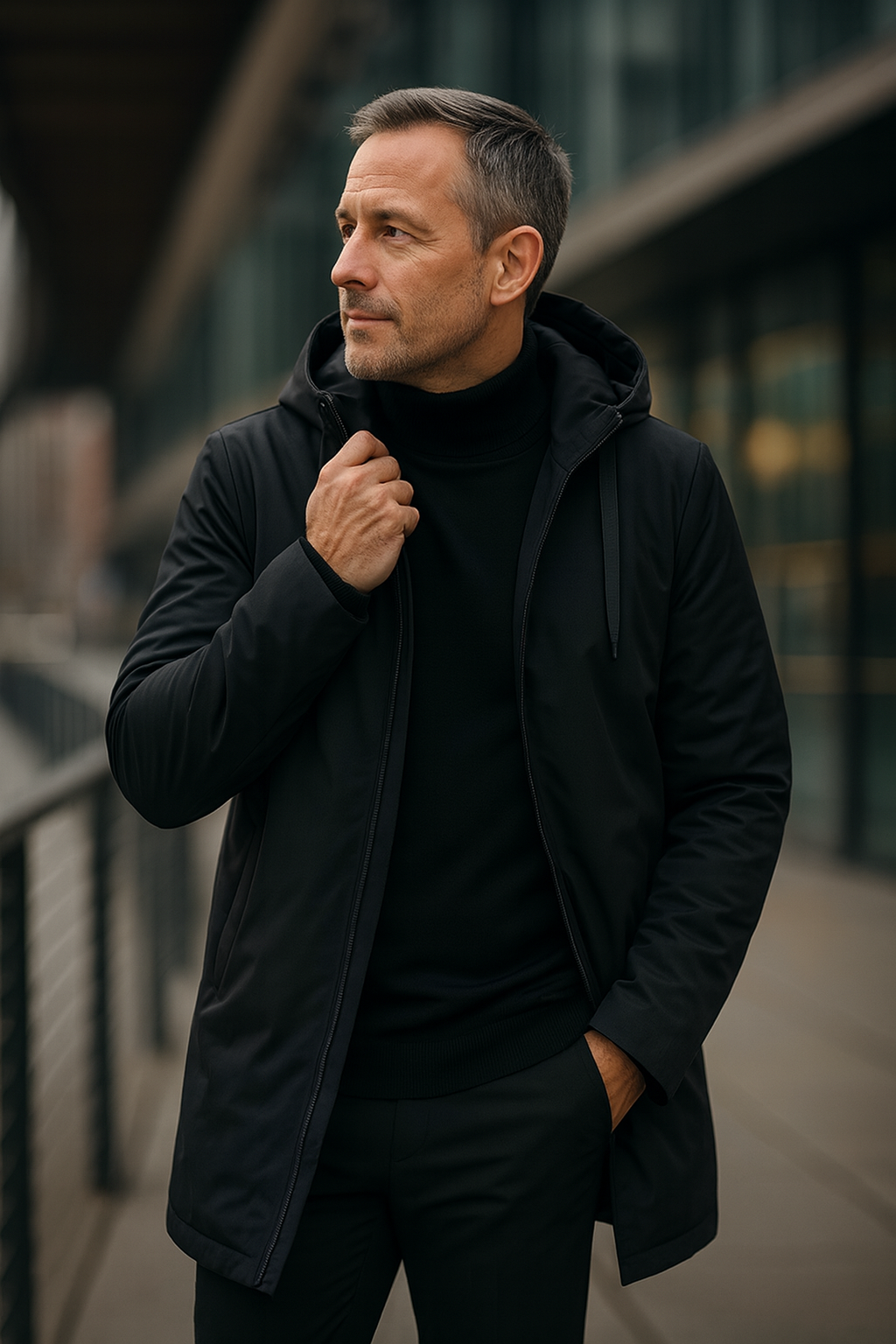 Gemacht für kalte Wintertage verbindet dieser Mantel eine robuste, wetterfeste Außenfläche mit einer warmen, angenehm tragbaren Innenausstattung. Die mittellange Silhouette sorgt für Bewegungsfreiheit und einen modernen, gepflegten Look, während die integrierte Kapuze und der hohe Kragen zusätzlichen Schutz bieten. Ein vielseitiger Begleiter, der sich mühelos über Alltags-, Freizeit- oder Business-Outfits tragen lässt.