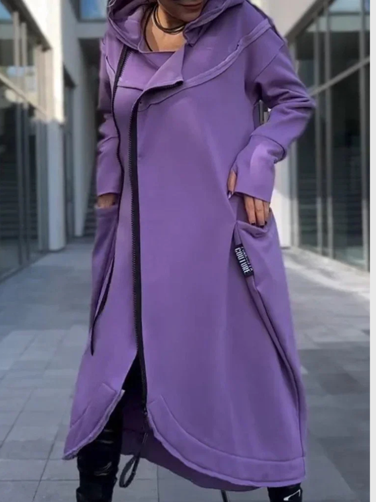 Hergestellt aus leichtem, atmungsaktivem Stoff mit einem weichen, wärmenden Griff, umhüllt Evelisse dich den ganzen Tag mit Komfort. Der lange, schmeichelhafte Schnitt und der asymmetrische Saum verlängern die Figur, während der Reißverschluss vorne für Bequemlichkeit und einen Hauch modernen Flairs sorgt. Perfekt zum Layering über Jeans oder Leggings oder als lässiges Kleid für sich allein, passt dieser Hoodie elegant zu deinem Lebensstil. Zeitlos, praktisch und schick – es ist das Stück, auf das deine Garderobe gewartet hat.