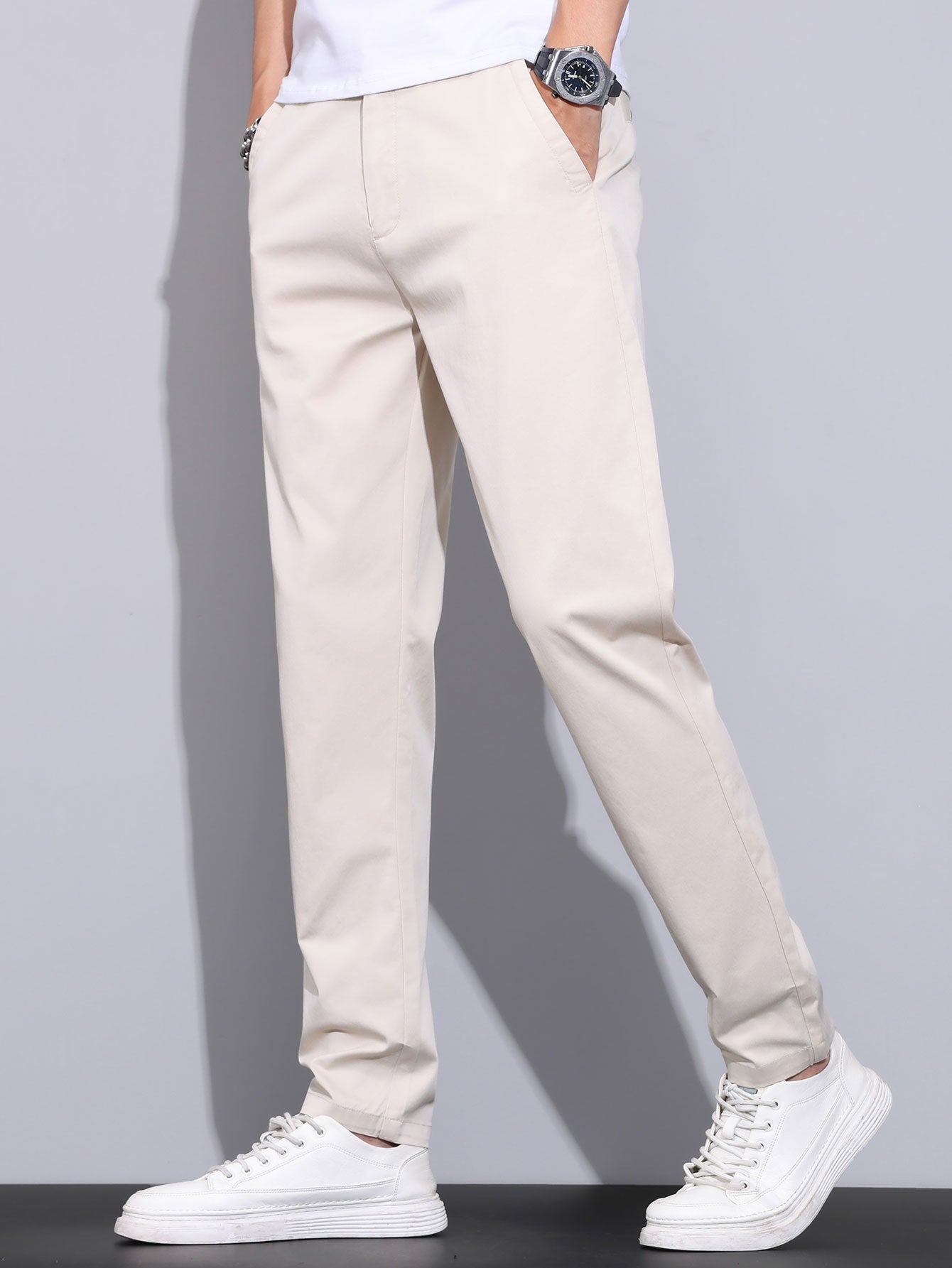 Bleiben Sie mühelos stilvoll und bequem in diesen klassischen, einfarbigen, gerade geschnittenen Hosen. Hergestellt aus einem atmungsaktiven Stoff, verfügen diese Hosen über einen teilweise elastischen Bund mit Knopfverschluss und Reißverschluss für einen sicheren Sitz. Die klare Silhouette und die umgeschlagenen Säume verleihen einen raffinierten Touch, wodurch sie sowohl für legere als auch für smart-casual Anlässe perfekt geeignet sind.