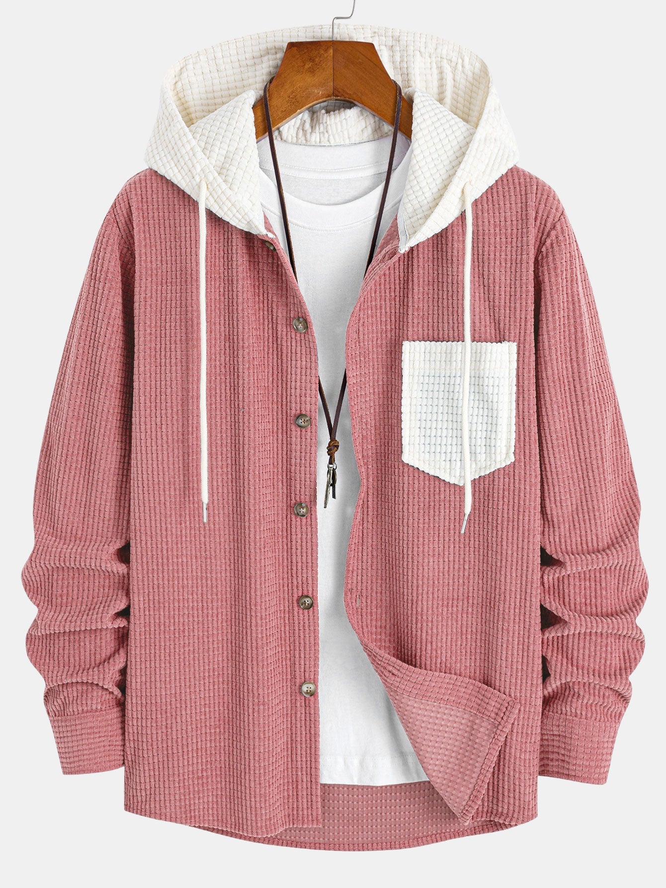 Dieses Kapuzenhemd bietet eine lockere Passform mit weichem, atmungsaktivem Waffelstrukturstoff. Der blaue Körper und die kontrastierende weiße Kapuze und Tasche schaffen einen frischen, geschichteten Look. Knopfleiste vorne und verstellbare Kordelzugkapuze sorgen für Stil und Praktikabilität. Perfekt für mühelose Streetwear-Outfits im Frühling und Herbst.