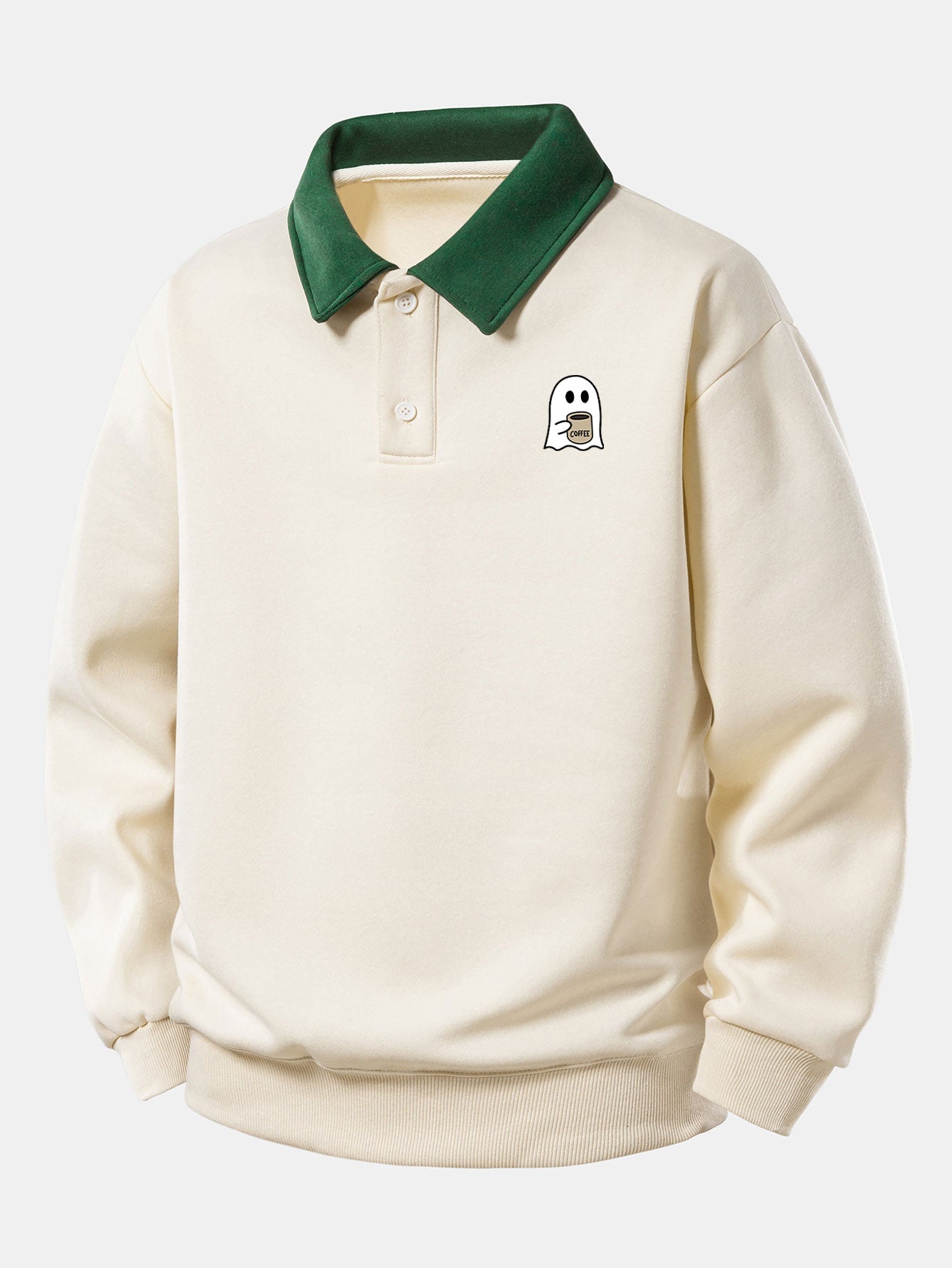 Relaxed Fit Ghost Coffee Print Contrast Polo Sweatshirt