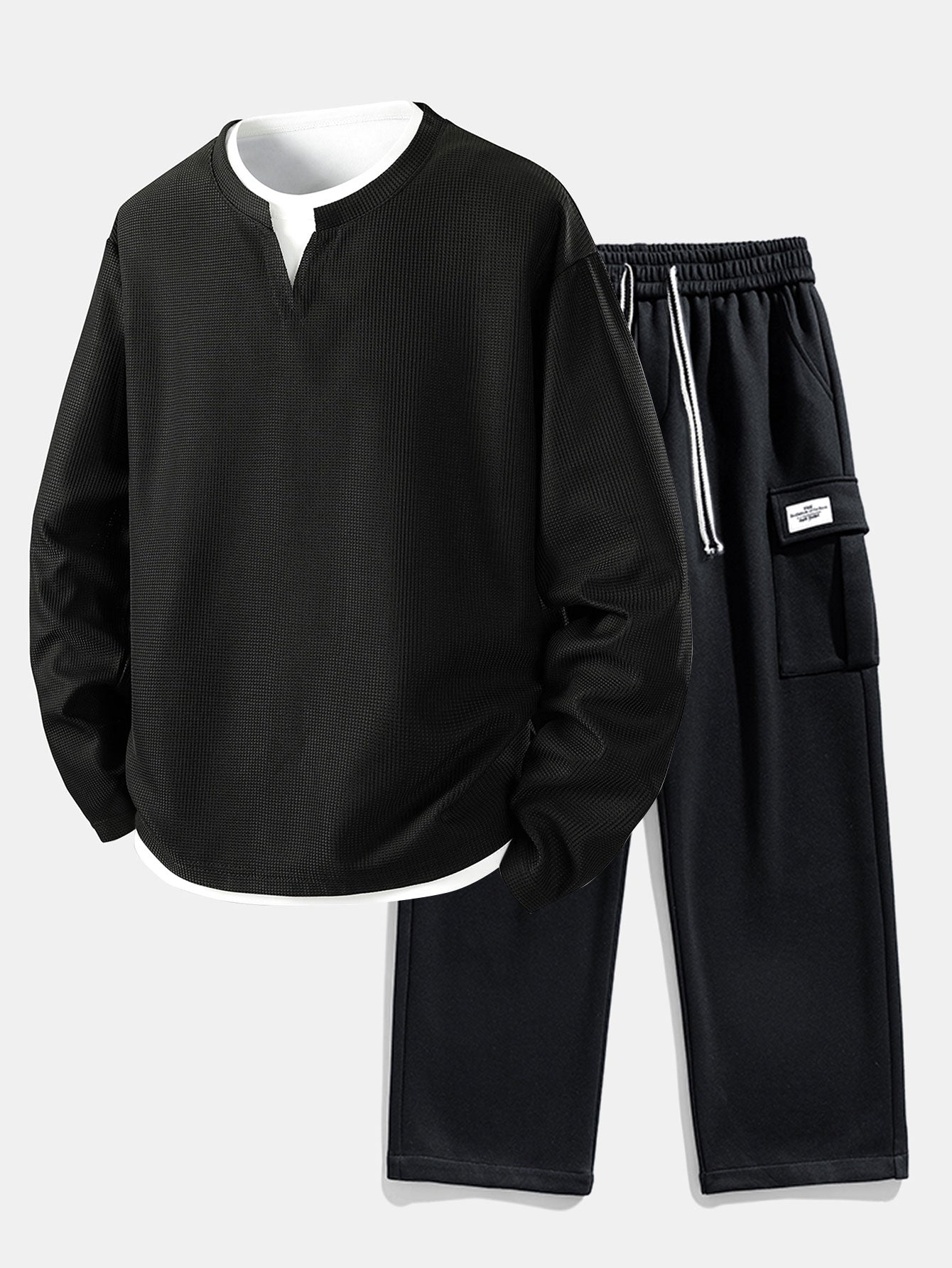 Relaxed Fit Long Sleeve 2-in-1 Waffle T-Shirt & Straight Leg Jersey Cargo Pants